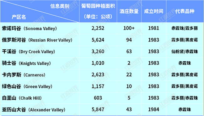 索諾瑪縣擁有多達(dá)17個(gè)AVA子產(chǎn)區(qū),每個(gè)產(chǎn)區(qū)都擁有自己獨(dú)特的歷史、地理?xiàng)l件和代表品種,以下兩個(gè)表格是索諾瑪縣子產(chǎn)區(qū)的基本信息概況。