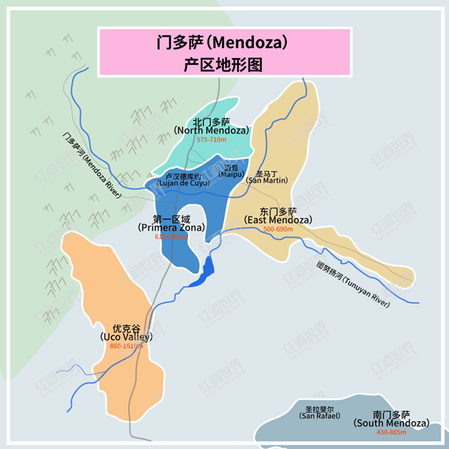 在阿根廷的中西部,美麗的安第斯山脈(Andes Mountain Range)山腳下,坐落著阿根廷最重要的葡萄酒產區之一——門多薩(Mendoza)。該產區大致可分為五個子區域——第一區域(Primera Zona)、東門多薩(East Mendoza)、北門多薩(North Mendoza)、優克谷(Uco Valley)和南門多薩(South Mendoza)。產區內的葡萄園面積占阿根廷葡萄園總面積的75%,酒莊數量也穩居阿根廷國內第一。
