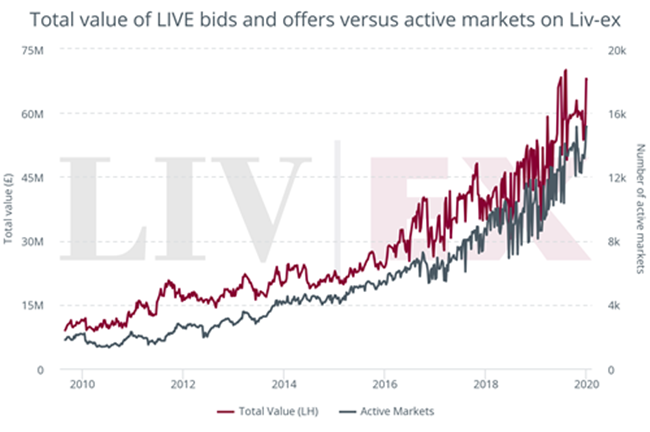自動(dòng)化最明顯的影響是使Liv-ex市場的葡萄酒大增。 如我們在最近的有關(guān)博客中指出,在2019年7月,出價(jià)和報(bào)價(jià)總值創(chuàng)7000萬英鎊新高。