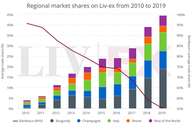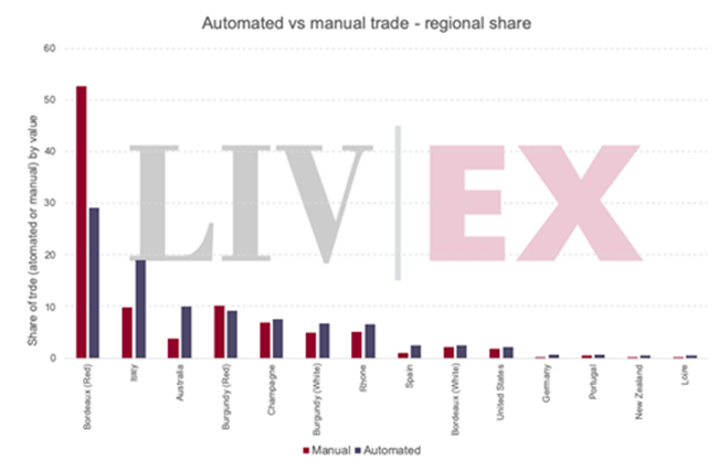 下圖按酒區(qū)來顯示手動(dòng)和自動(dòng)交易的比例。 由此可見,波爾多等傳統(tǒng)酒區(qū)在采用前者的比例要比后者高得多。