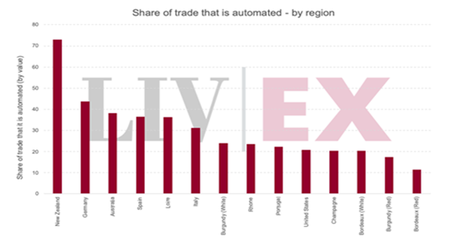 我們發(fā)現(xiàn),在Liv-ex上非傳統(tǒng)強(qiáng)勢市場的酒區(qū),它們會(huì)有更多葡萄酒通過自動(dòng)化來進(jìn)行交易。 如新西蘭:該酒區(qū)有超過70%的葡萄酒交易都涉及自動(dòng)化。