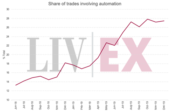 如下圖所示,在過去的18個(gè)月,在Liv-ex上涉及自動(dòng)化的交易數(shù)量一直上升。