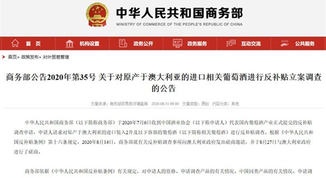 自本公告發布之日起,商務部對原產于澳大利亞的進口相關葡萄酒進行反補貼立案調查,本次調查確定的補貼調查期為2019年1月1日至2019年12月31日,產業損害調查期為2015年1月1日至2019年12月31日。