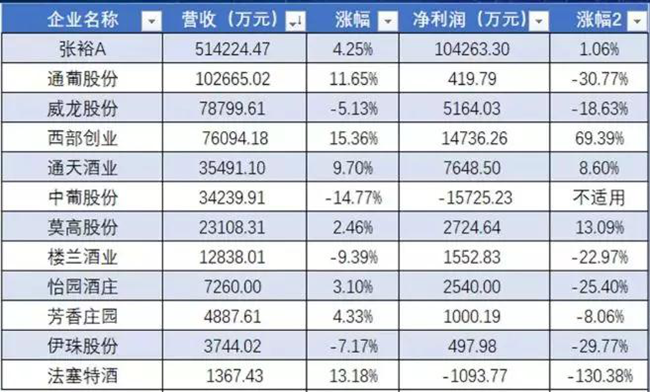 2018年被認(rèn)為是中國葡萄酒行業(yè)的調(diào)整之年,整個葡萄酒行業(yè)呈現(xiàn)出小幅下滑的局面,據(jù)國家統(tǒng)計局?jǐn)?shù)據(jù),2018年全國規(guī)模以上葡萄酒企業(yè)總產(chǎn)量62.9萬千升,比2017年下降7.36%;累計實現(xiàn)銷售收入288.51億元,同比下降9.51%;累計實現(xiàn)利潤總額30.63億元,同比下降9.46%。這12家上市企業(yè)發(fā)布的年報數(shù)據(jù),與去年整年的行業(yè)氛圍相符。大概也正是因為去年行業(yè)“看跌”的聲音不絕于耳,提前打了“預(yù)防針”,當(dāng)全年數(shù)據(jù)公布和12家公司年報披露時,行業(yè)沒有表現(xiàn)出很大的落差。
