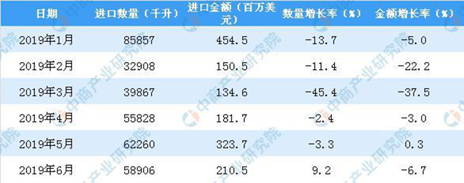 從金額方面來看,2019年1-6月中國葡萄酒進口金額為1154.1百萬美元,同比下降9.2%。